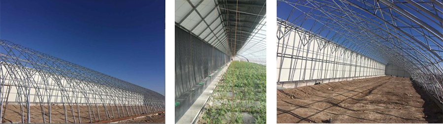該溫室骨架為熱鍍鋅鋼材焊接,后墻為熱鍍鋅鋼材組裝,采用彩鋼板后墻保溫和相變蓄熱系統(tǒng)代替土墻和磚墻等蓄熱體,解決裝配式日光溫室的蓄放熱問(wèn)題,實(shí)現(xiàn)日光溫室部件的工廠化生產(chǎn)和安裝的標(biāo)準(zhǔn)化裝配。